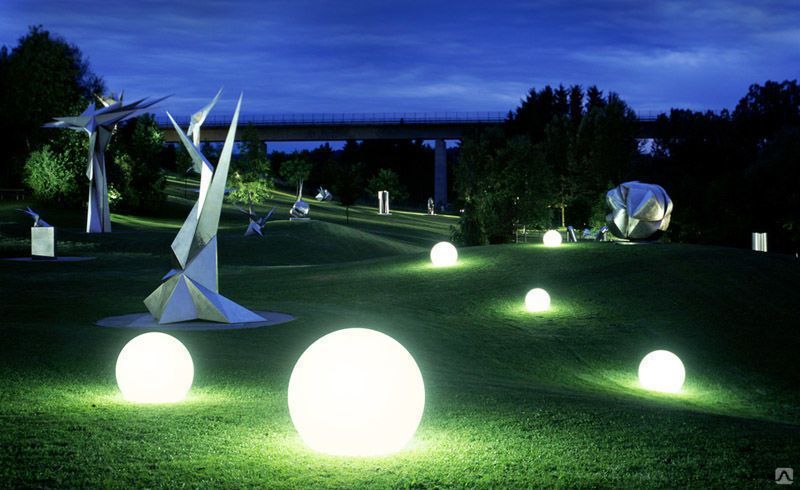 • Сферические ландшафтные светильники. Традиционный вид осветительных приборов, состоящий из опоры и шарообразного плафона из стекла или пластика. Обеспечивают мощный равномерный световой поток, обладают ослепляющим эффектом. Объекты вокруг становятся в темноте не видны. Разновидностью являются полусферические ландшафтные светильники, снабженные отражателем. Благодаря ему поток света направляется вниз и в стороны. Используются для подсветки дорожек, мест отдыха и других элементов;