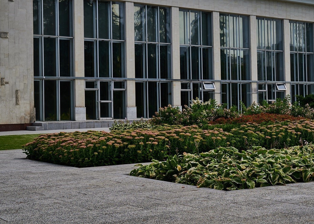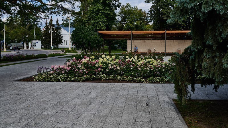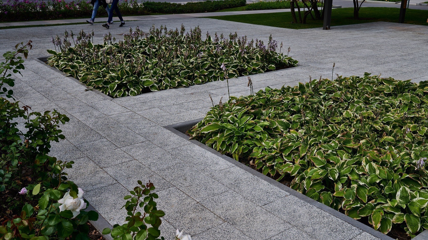 При блаустройстве сквера в ВДНХ были выбраны крупноформатные бесфасочные тротуарные плиты серии Stone Top с поверхностью из натурального камня.