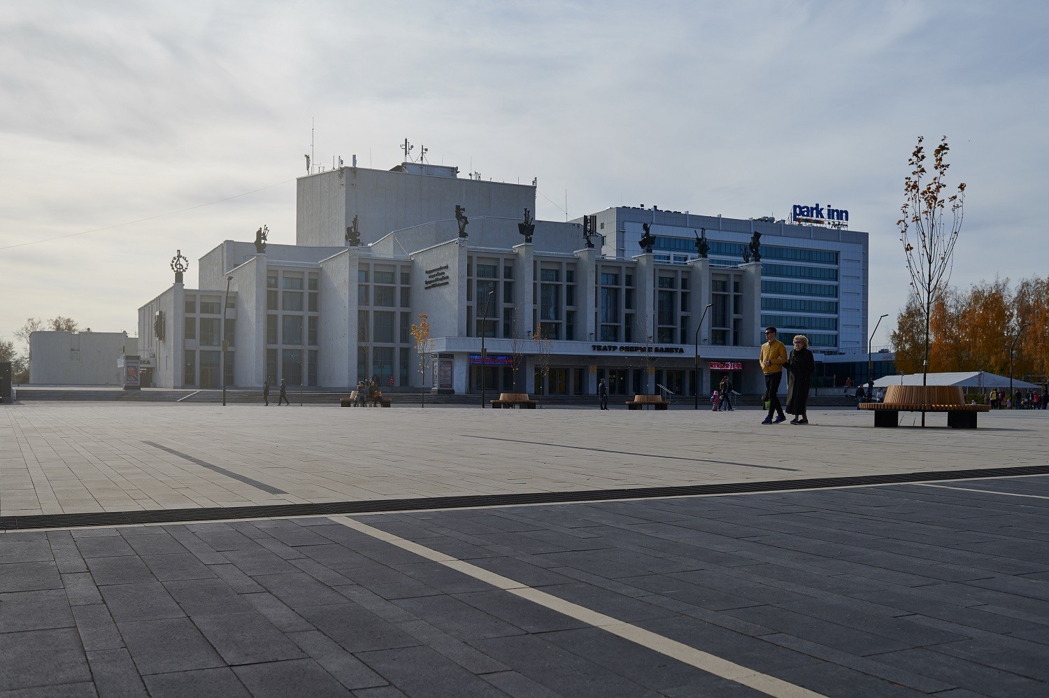 Во время благоустройства на площади заменили плитку, сделали газон, установили 171 светильник и посадили более 100 деревьев. Пространство из белой плитки перемежается с чёрной брусчаткой, которая напоминает клавиши рояля, ведущие к Театру оперы и балета.