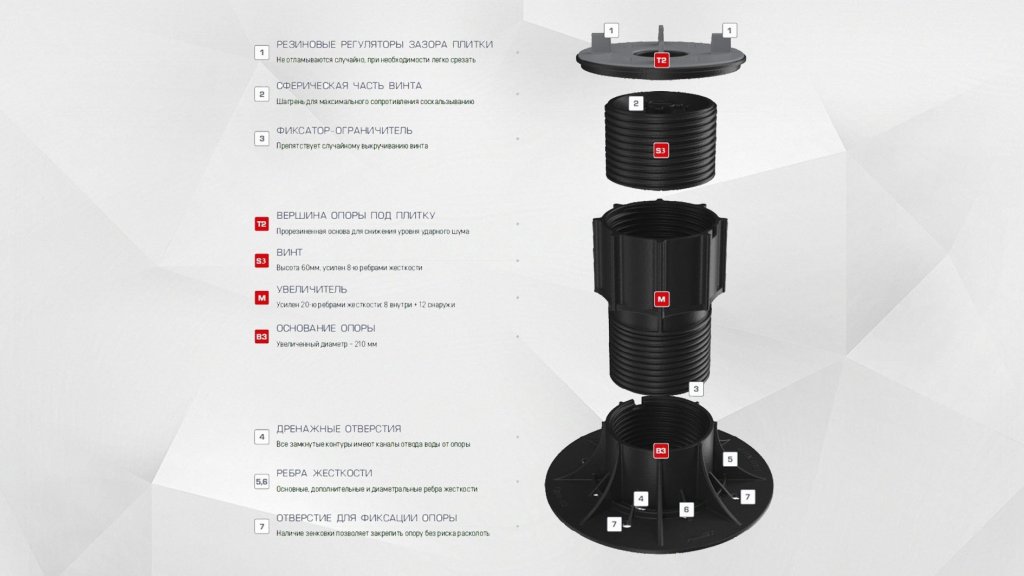 Прорезиненная нижняя поверхность вершины для плитки, в зацеплении со сферической частью опоры, имеющую шагрень, создает максимальное сопротивление скольжению, что обеспечивает надежную защиту от качания.