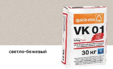 Цветной кладочный раствор quick-mix VK 01 с трассом для выполнения кирпичной кладки и одновременной отделки швов (в одном рабочем цикле) при температуре окружающего воздуха от -10°C до +5°C. Для сильно водопоглощающего лицевого кирпича с водопоглощением ~ 8-10%. Цвета: алебастрово-белый, светло-бежевый.