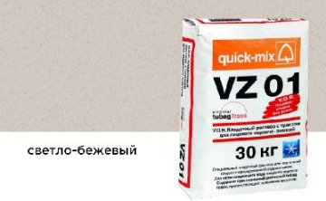 Цветной кладочный раствор quick-mix VZ 01 с трассом для выполнения кирпичной кладки и одновременной отделки швов (в одном рабочем цикле) при температуре окружающего воздуха от -10°C до +5°C. Для не поглощающего воду лицевого кирпича с водопоглощением ~ 2-5%. Цвета: алебастрово-белый, светло-бежевый.