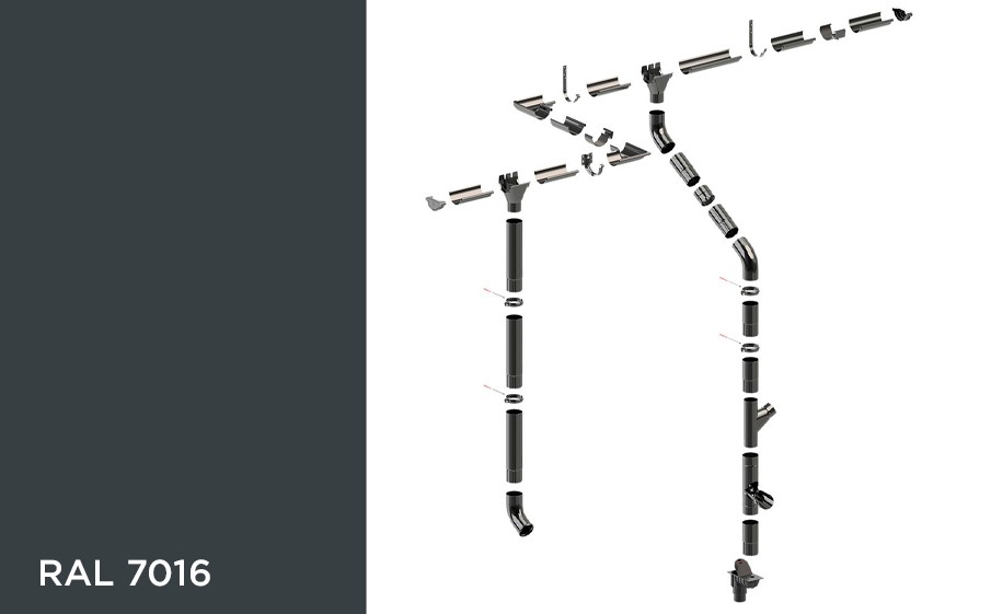 В составе водосточной системы KROP STAL, RAL 7016 сталь высшего качества (толщина не менее 0,6 мм), покрытая с обеих сторон четырьмя защитными слоями: цинком (не менее 275 г/м2), пассивирующим слоем, грунтовкой и органическим покрытием. KROP STAL устойчива к коррозии, экстремальным температурам, механическим и динамическим нагрузкам. Гарантия на механическую прочность 40 лет.