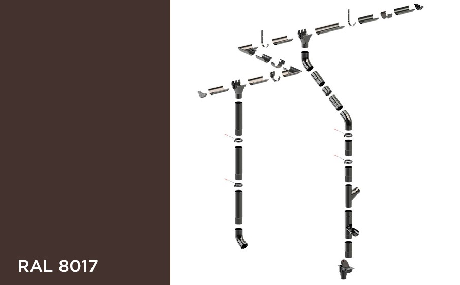 В составе водосточной системы KROP STAL, RAL 8017 сталь высшего качества (толщина не менее 0,6 мм), покрытая с обеих сторон четырьмя защитными слоями: цинком (не менее 275 г/м2), пассивирующим слоем, грунтовкой и органическим покрытием. KROP STAL устойчива к коррозии, экстремальным температурам, механическим и динамическим нагрузкам. Гарантия на механическую прочность 40 лет.