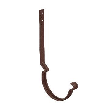 Поставляется с комплектом креплений. Конструкция крюка имеет более вытянутое и глубокое ребро жесткости, поэтому крюк выдерживает повышенные силовые нагрузки. Передний замок крюка фиксирует завиток желоба снаружи, и благодаря этому желоб удобно монтировать даже после установки фартука-капельника. Задний замок имеет конструкцию, исключающую смещение желоба под нагрузкой. Отверстия под крепеж выполнены с зенковкой под шляпку в потай. На передней части крюка расположен фирменный штамп - лилия.