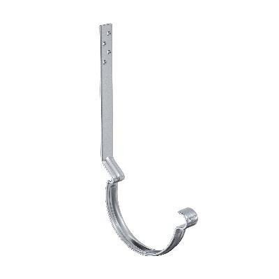 Поставляется с комплектом креплений. Конструкция крюка имеет более вытянутое и глубокое ребро жесткости, поэтому крюк выдерживает повышенные силовые нагрузки. Передний замок крюка фиксирует завиток желоба снаружи, и благодаря этому желоб удобно монтировать даже после установки фартука-капельника. Задний замок имеет конструкцию, исключающую смещение желоба под нагрузкой. Отверстия под крепеж выполнены с зенковкой под шляпку в потай. На передней части крюка расположен фирменный штамп - лилия.