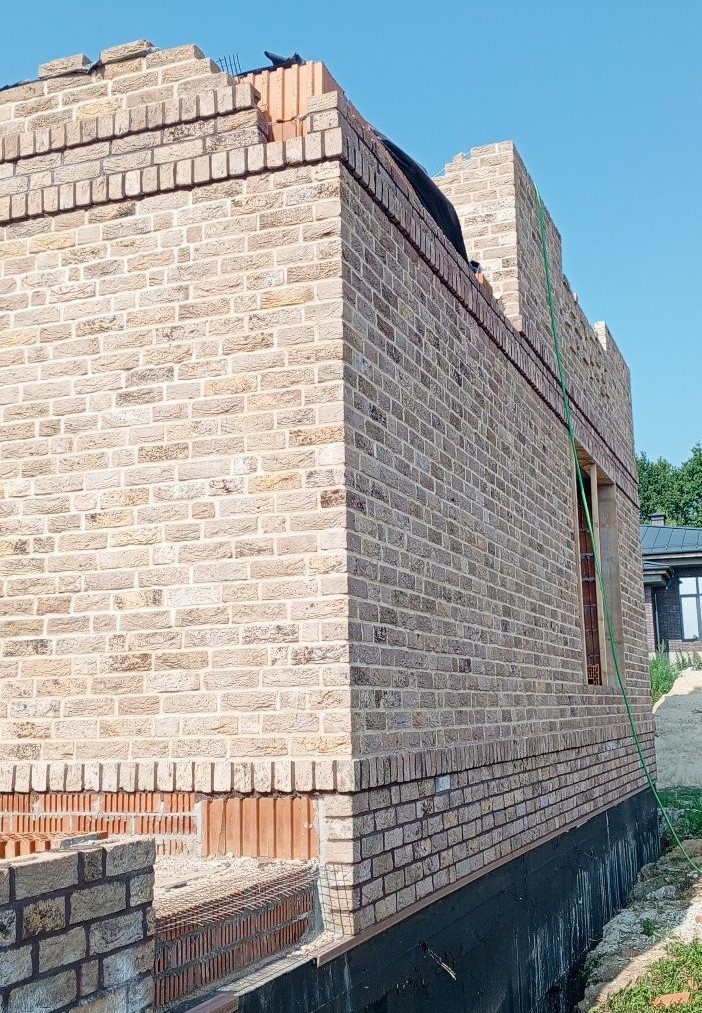 Для декоративных поясов (размерами 100х102х65) применяется облицовочный кирпич ручной формовки Донские Зори "Архангельское" и цветная кладочная смесь PEREL шоколадного цвета..