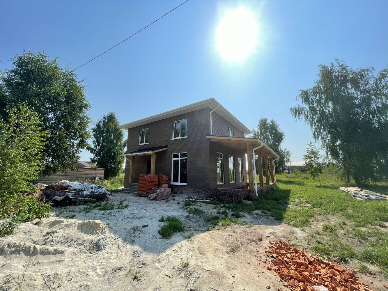 • Над окнами применена система подвесов кирпича BAUT Кровля - металлочерепица Kvinta, производитель - Grand Line, покрытие Velur RAL 7024