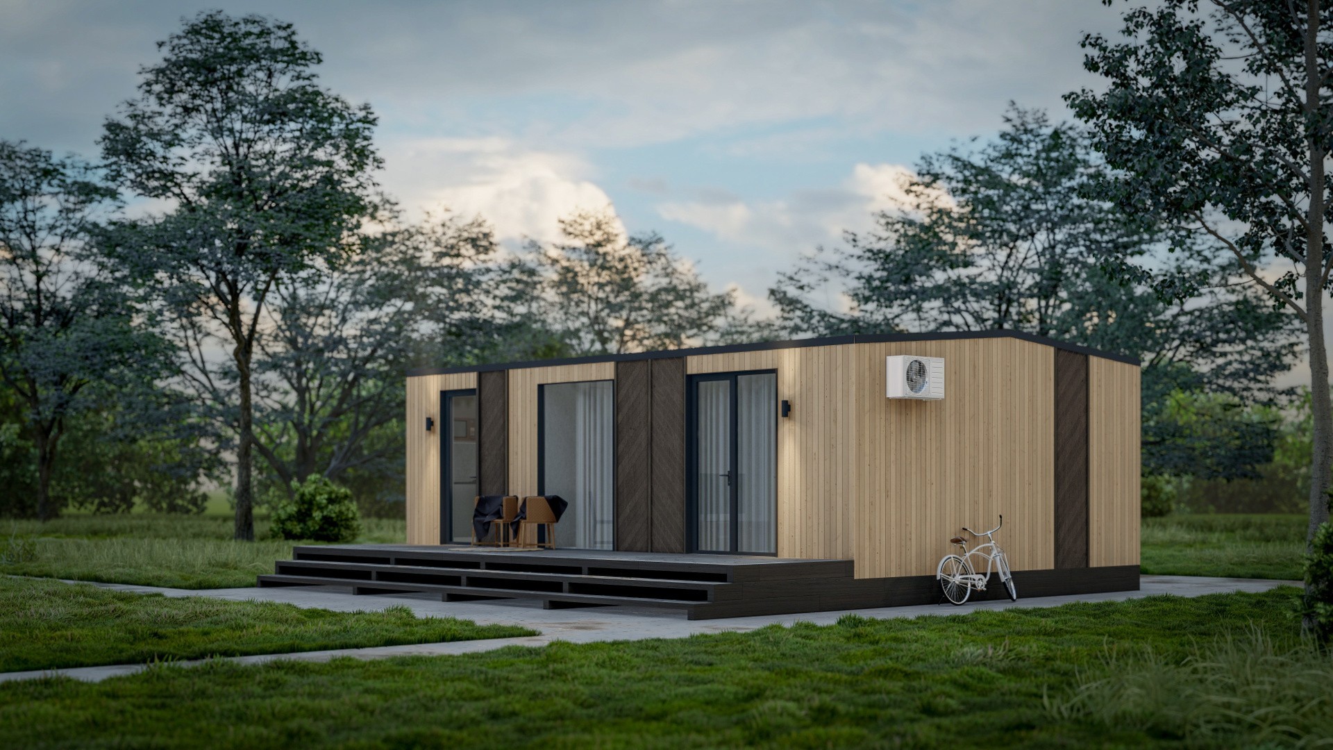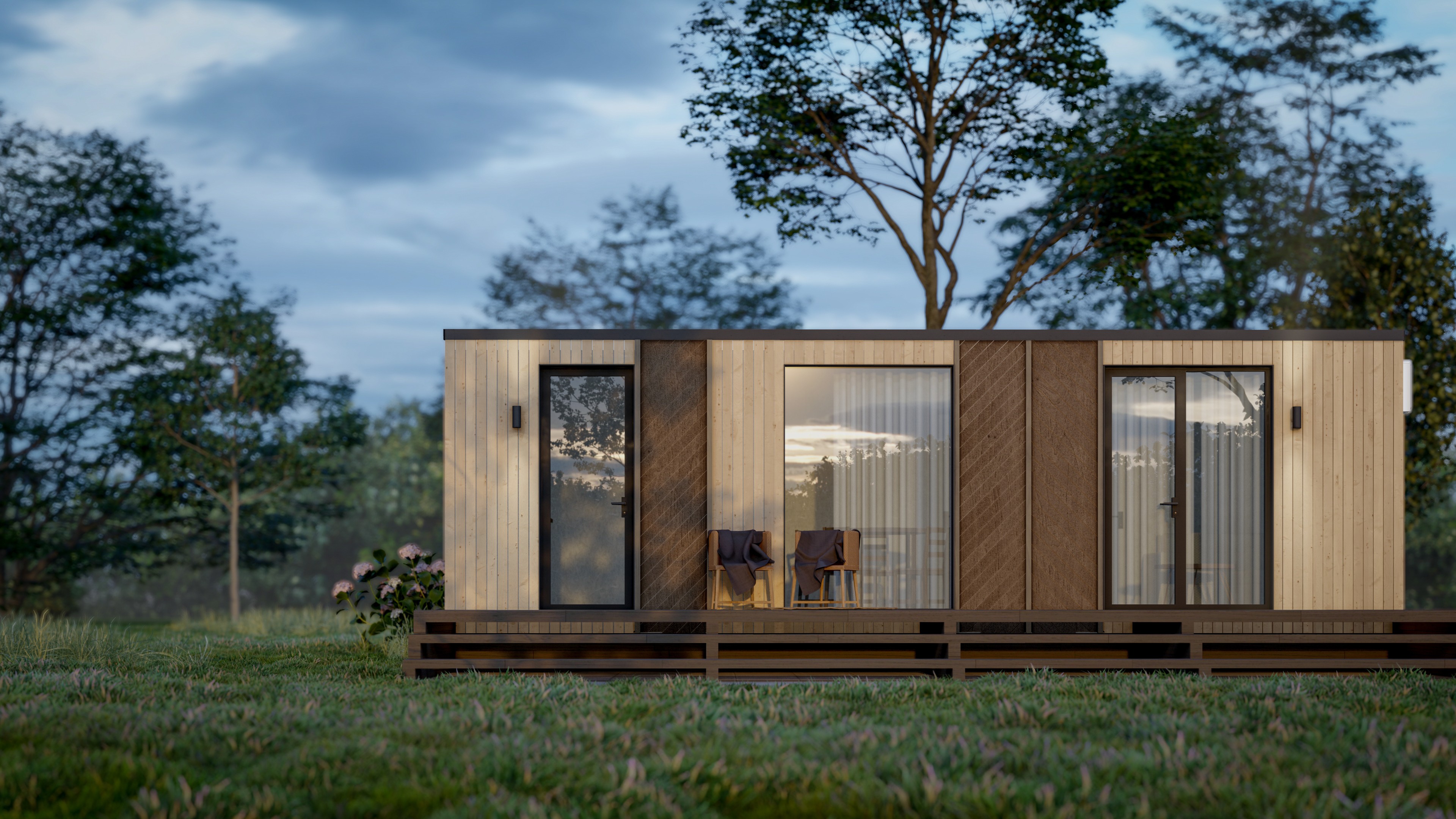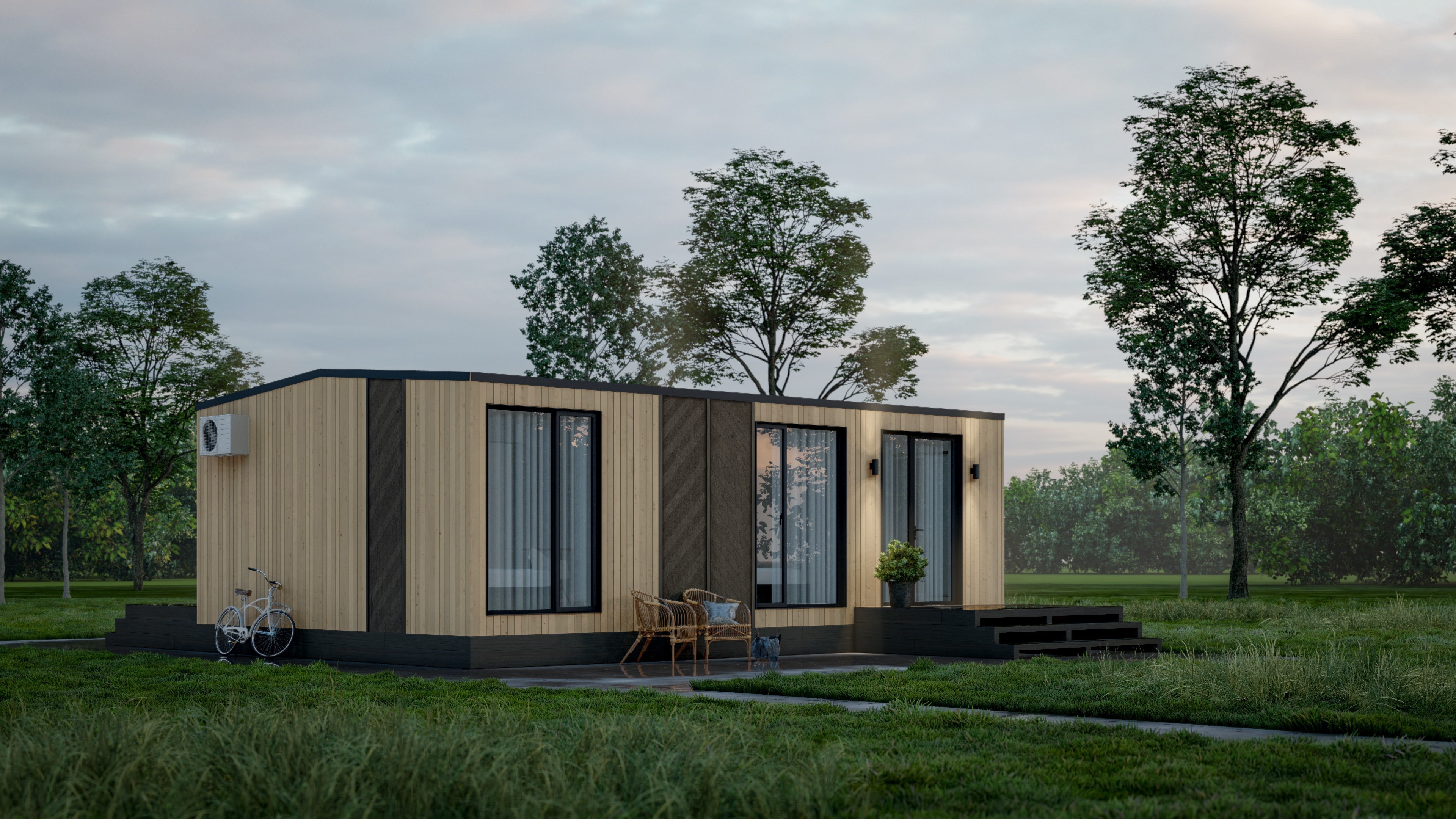 Входная дверь и распашные окна: двухкамерные стеклопакеты (4−14−4-14−4) с напылением Solar на внешнем стекле.