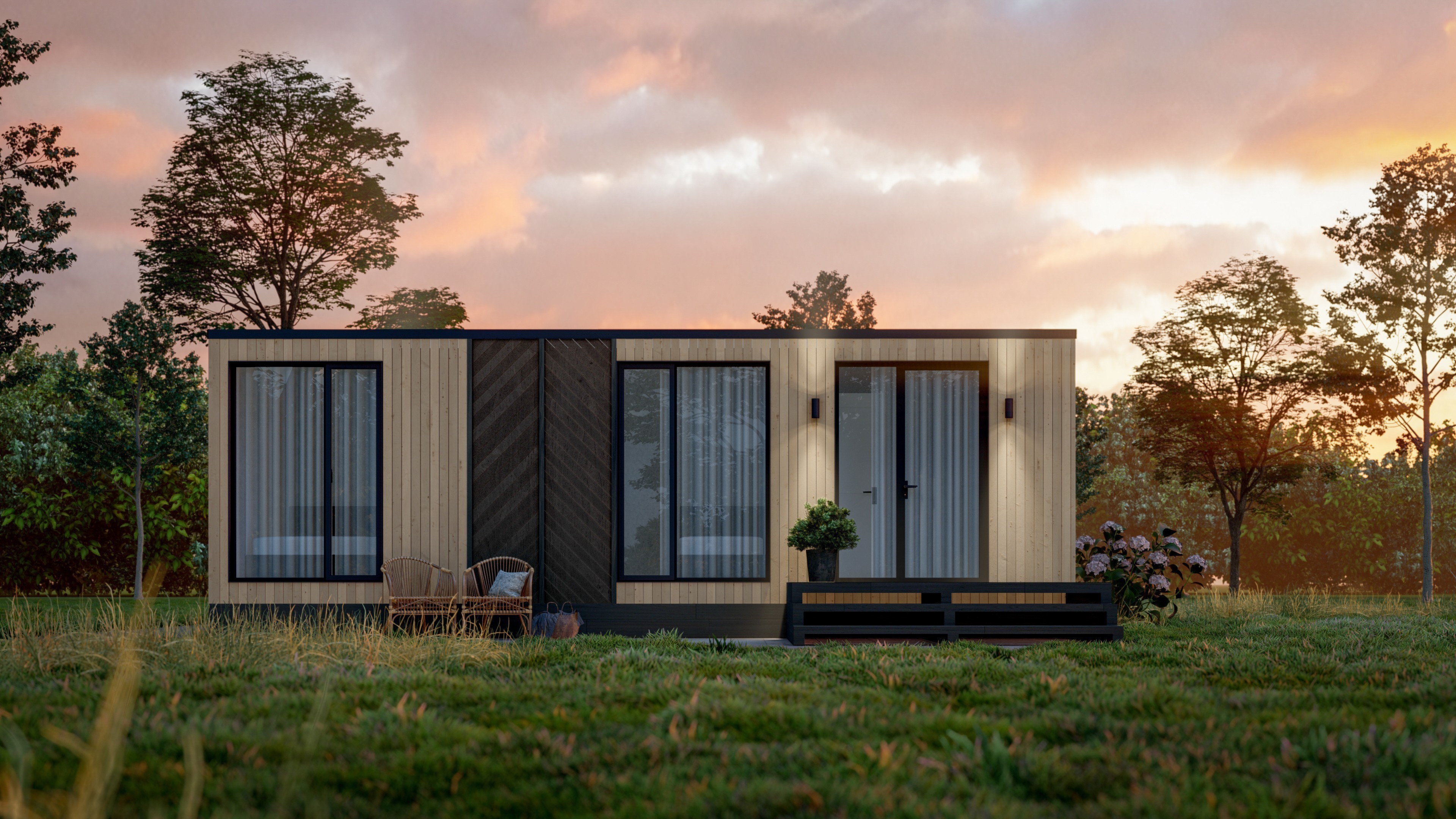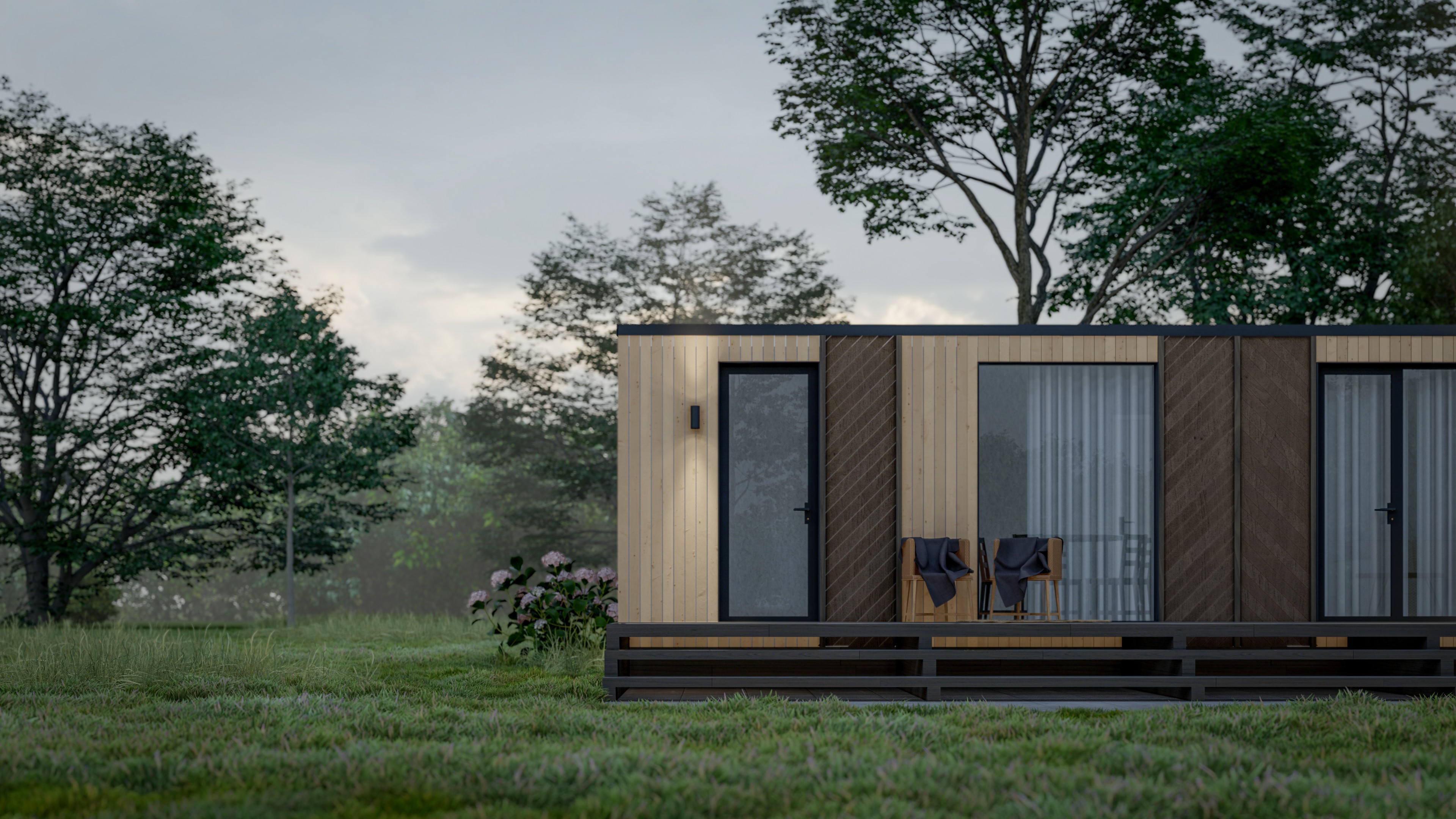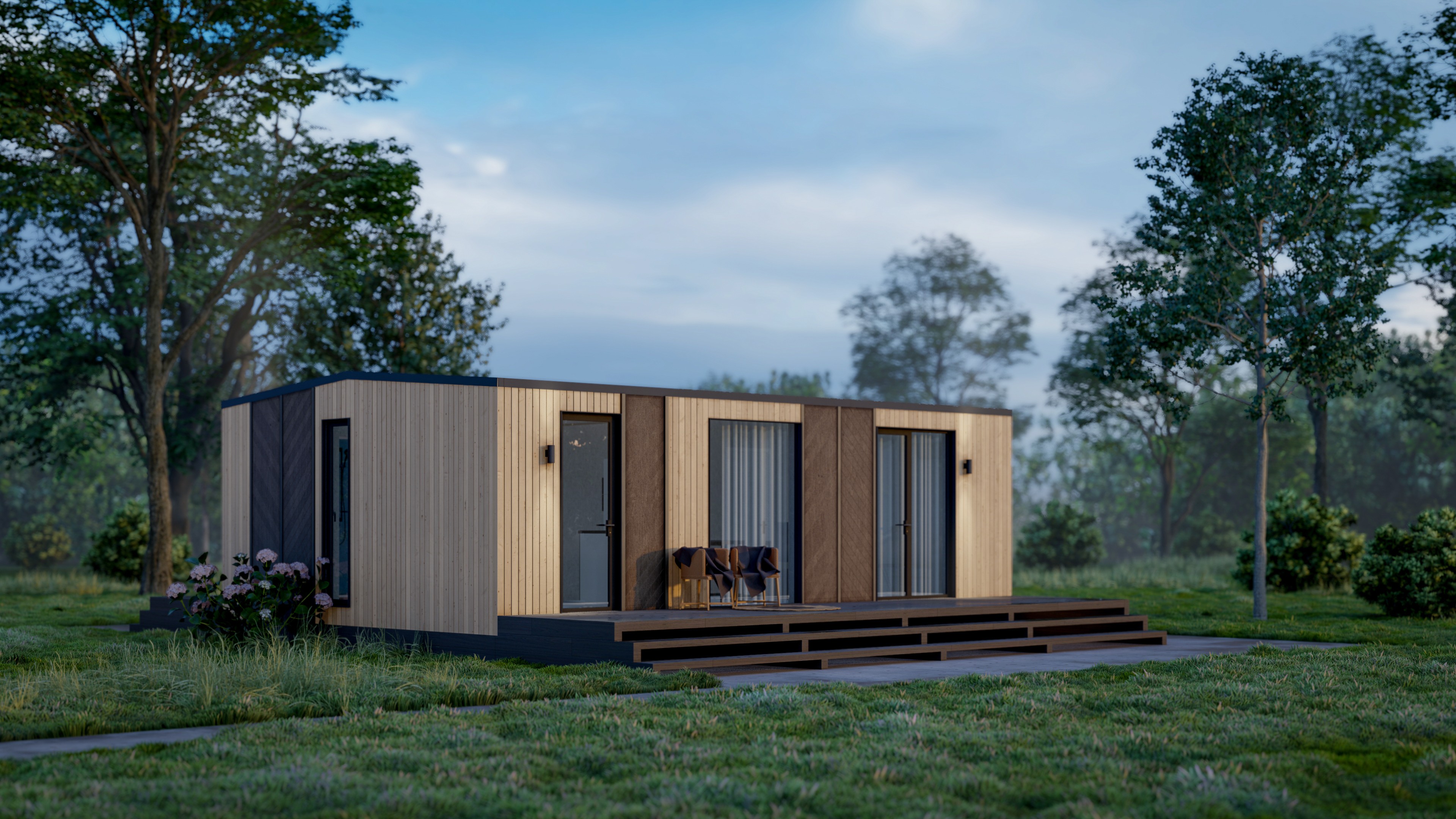 Входная дверь и распашные окна: двухкамерные стеклопакеты (4−14−4-14−4) с напылением Solar на внешнем стекле.