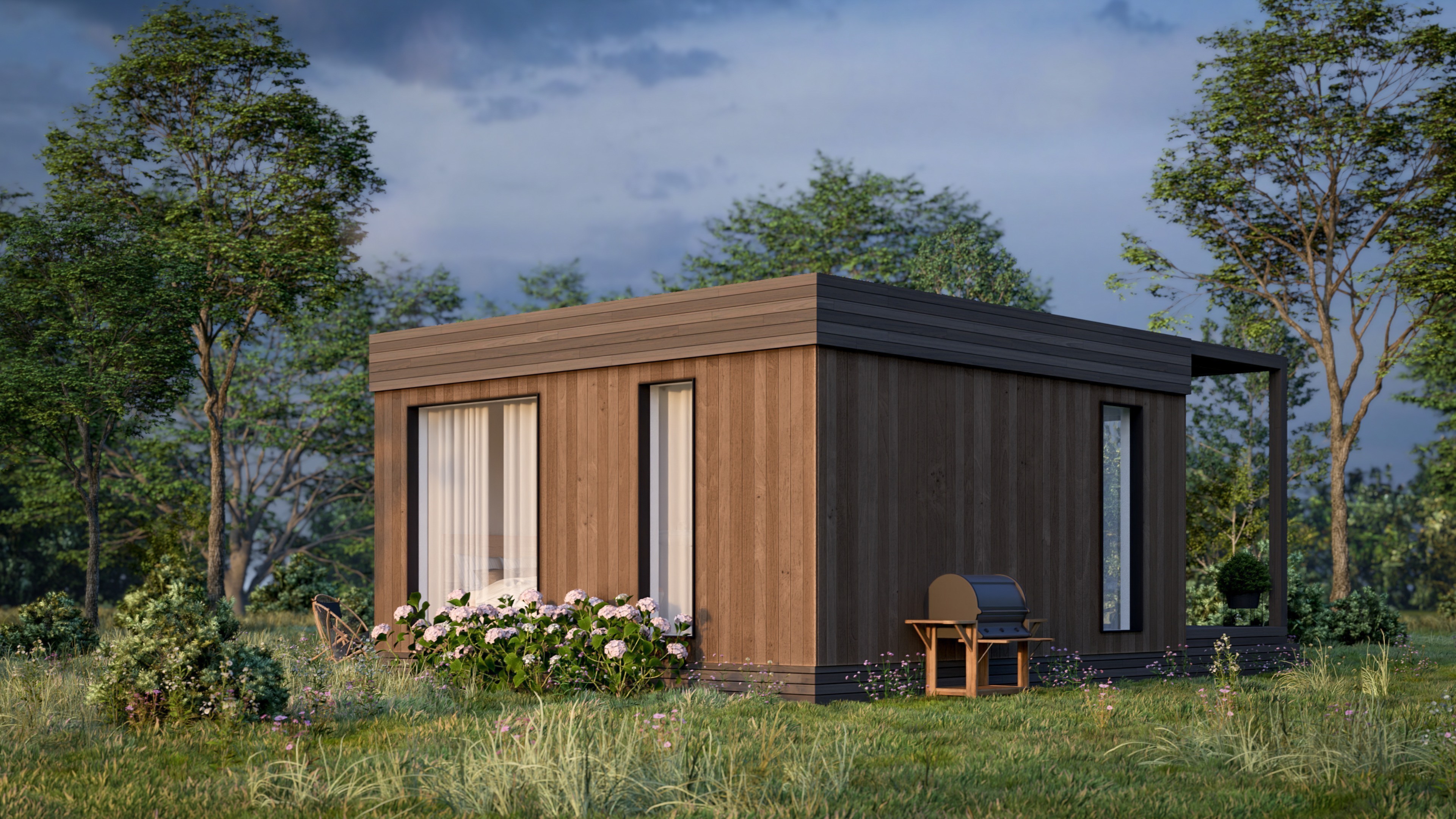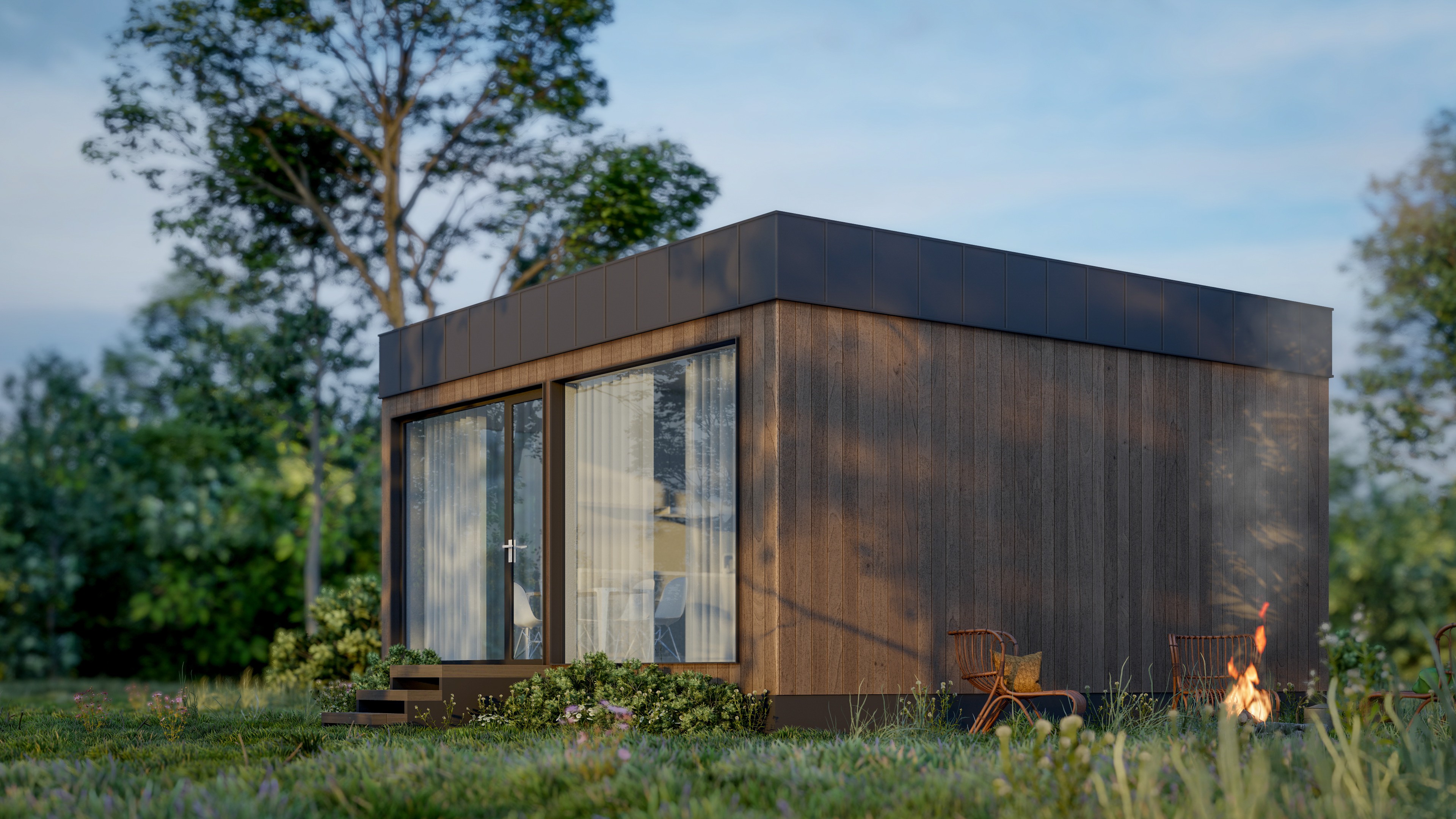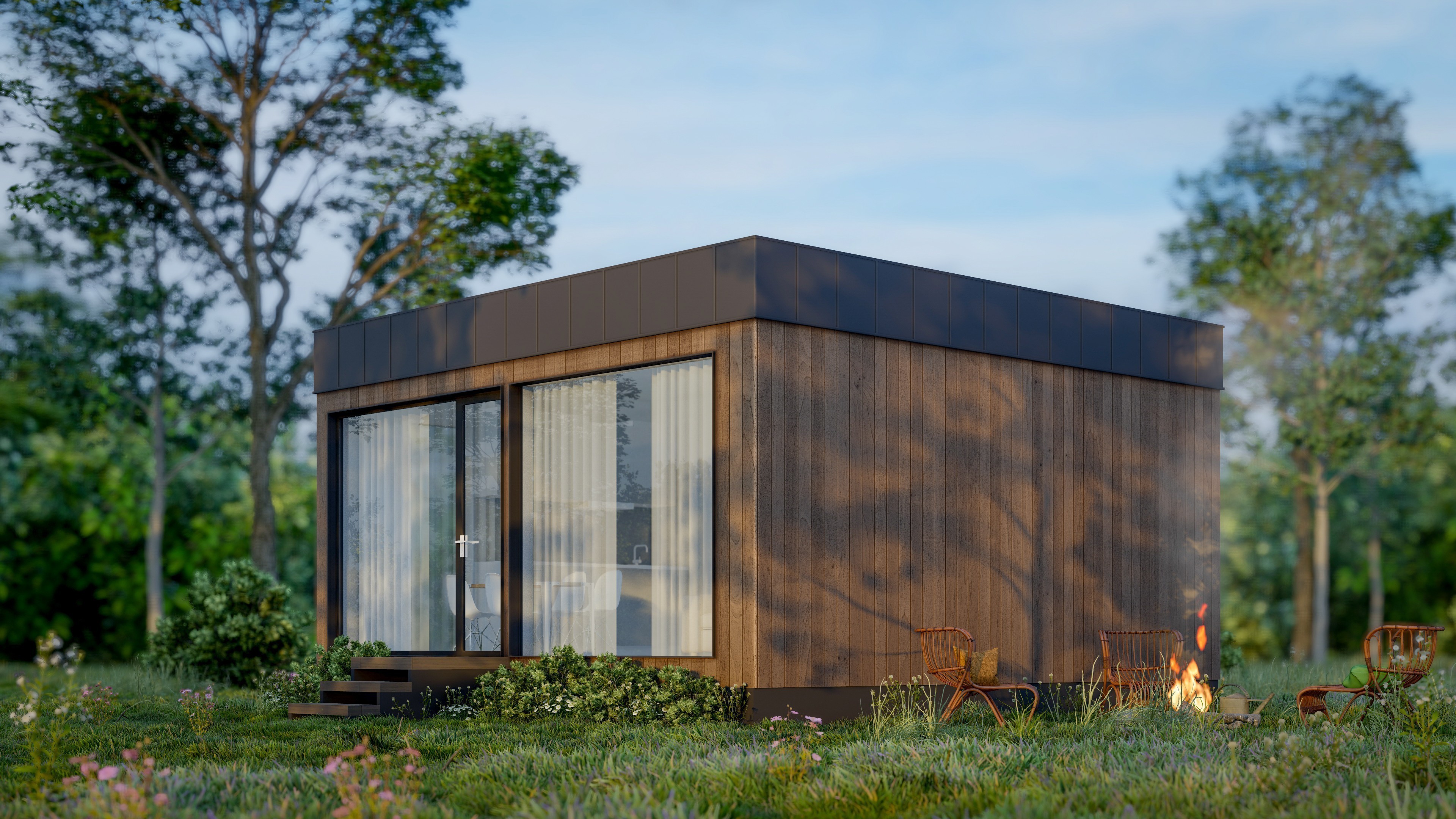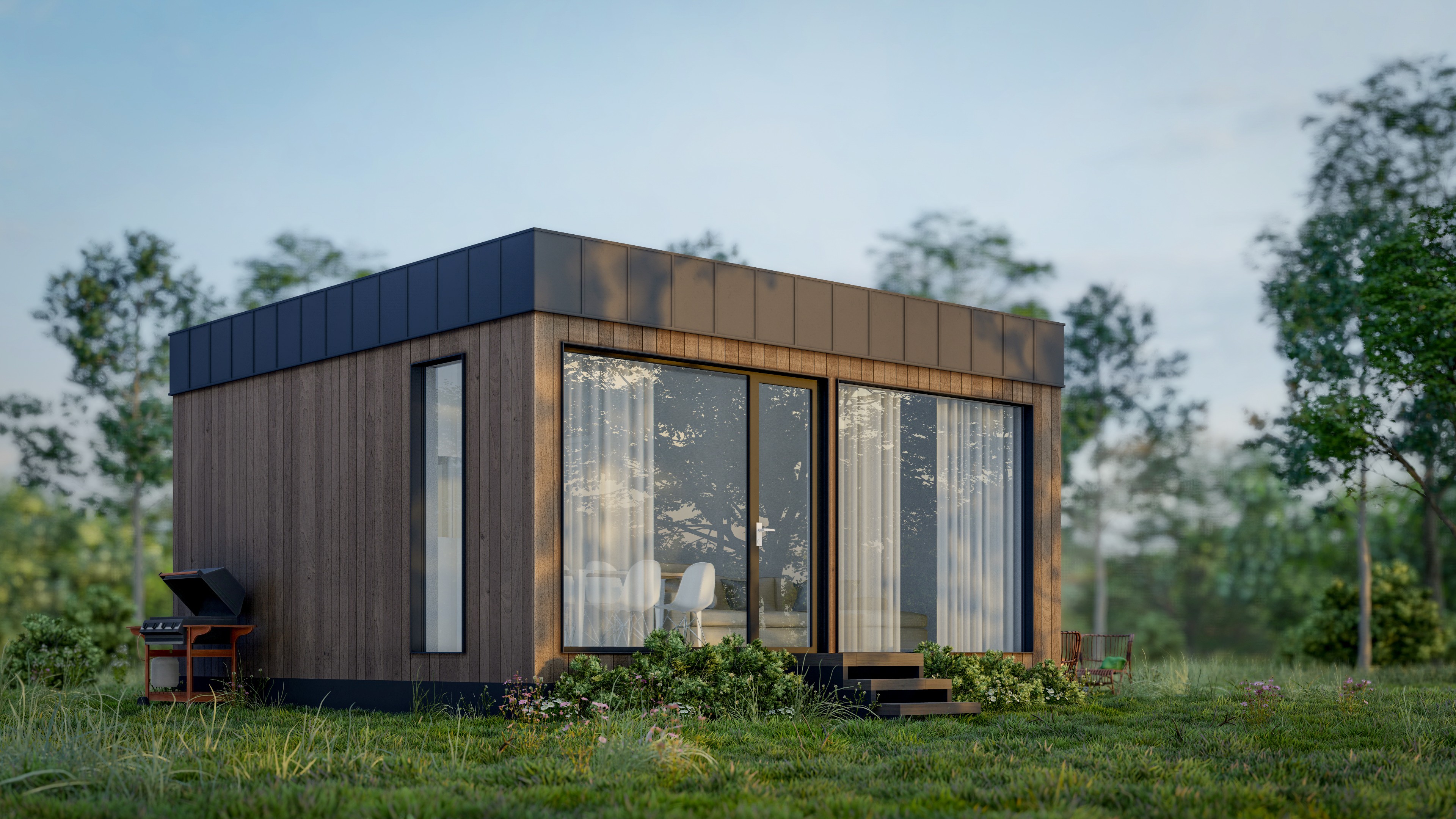 Входная дверь и распашные окна: двухкамерные стеклопакеты (4−14−4-14−4) с напылением Solar на внешнем стекле.