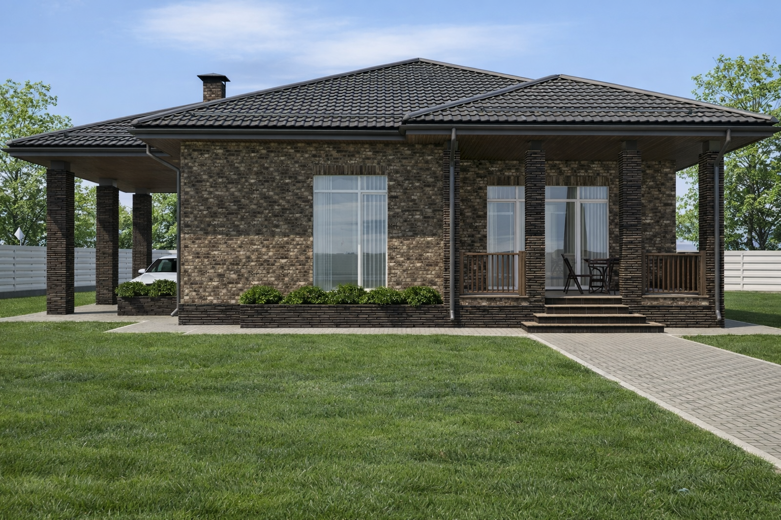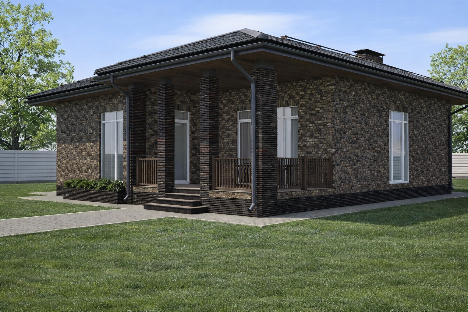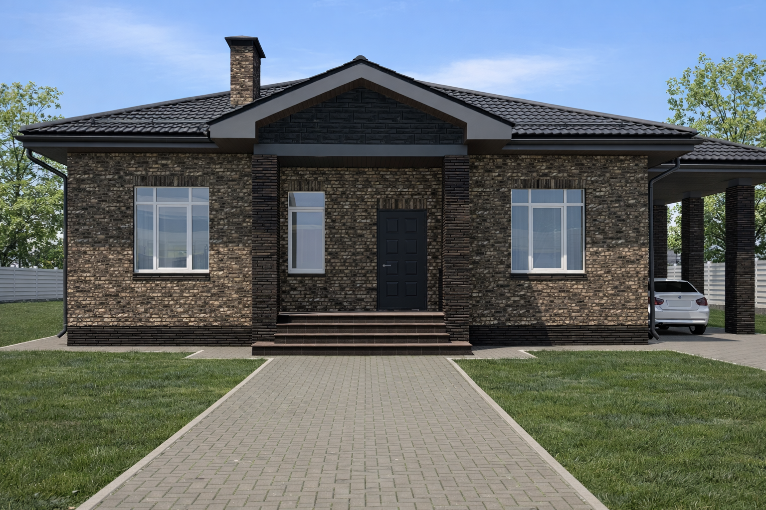 Одноэтажный дом общей площадью 108 квадратных метров. Стены выполнены из керамзитобетонных блоков.