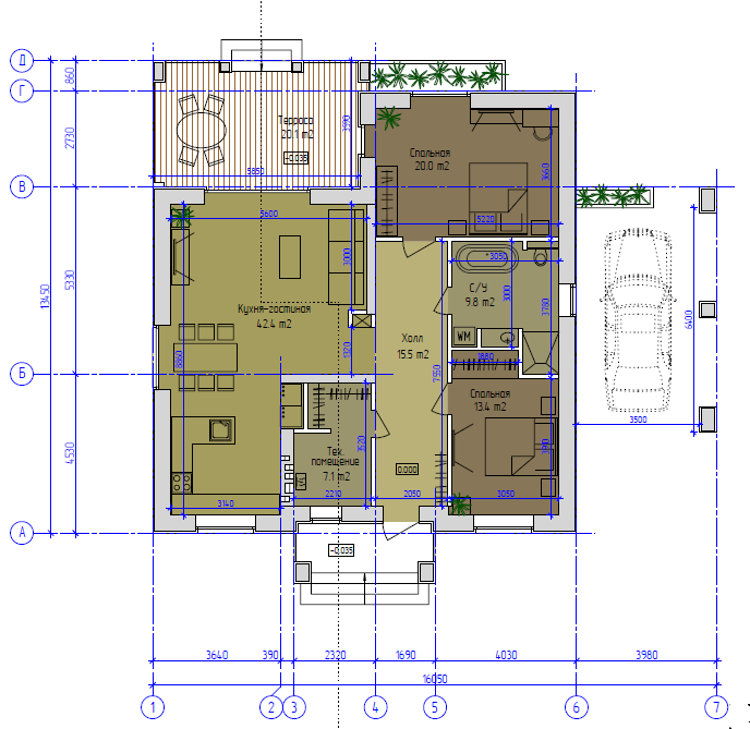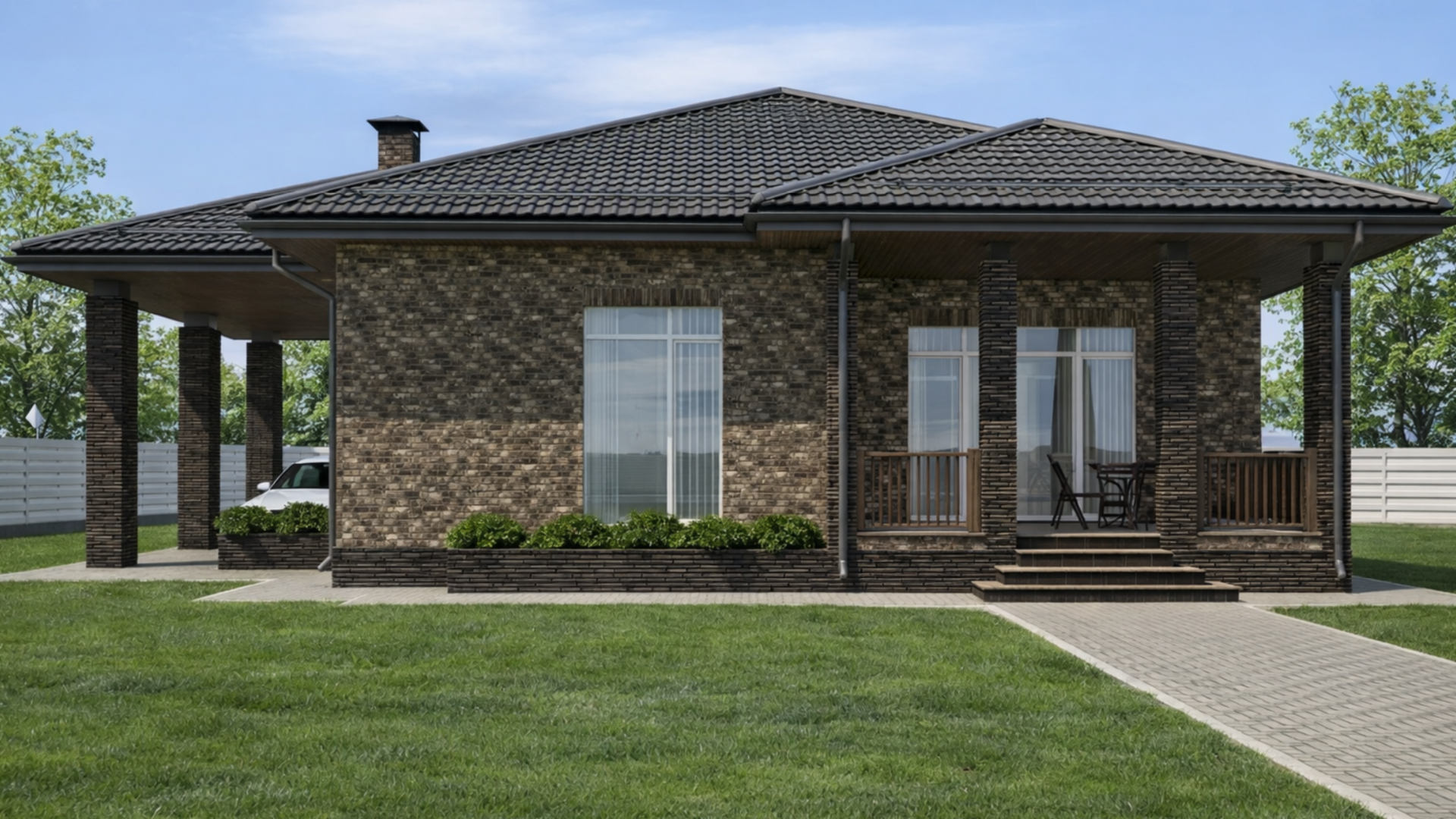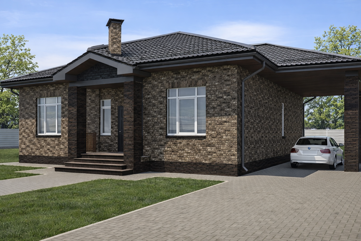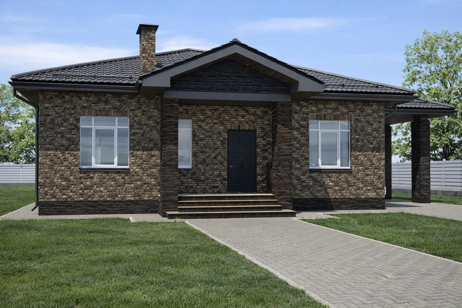 Одноэтажный дом общей площадью 108 квадратных метров. Стены выполнены из керамзитобетонных блоков.
